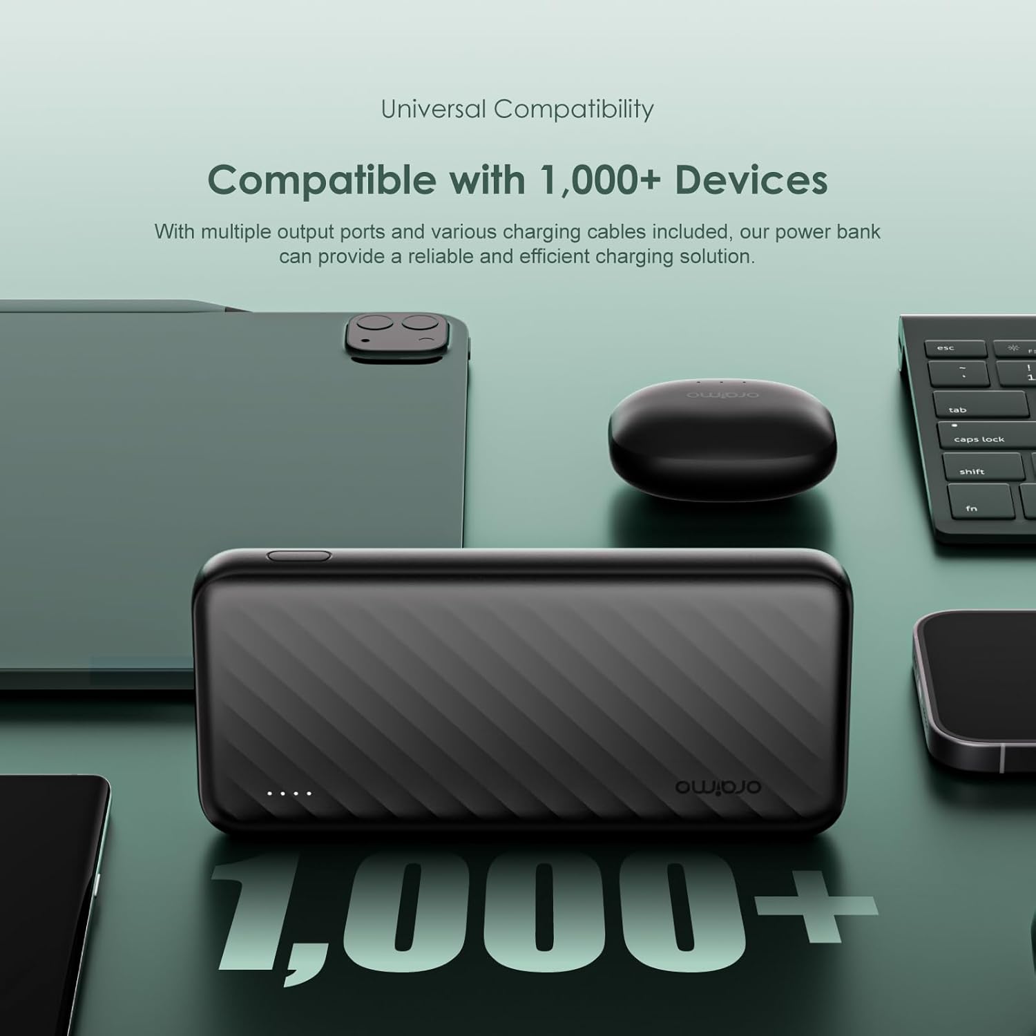 - ⚡【Wide Compatibility,Delivers Rapid Charging for Various Devices】Equipped with oraimo's exclusive chip, AniFast power bank can intelligently identify the fast-charging protocol of your device to deliver the speediest possible charge.it can not only charge for all smartphones but also for most accessories,like TWS earphone, smart watch, electric toothbrush, bluetooth speaker and more.