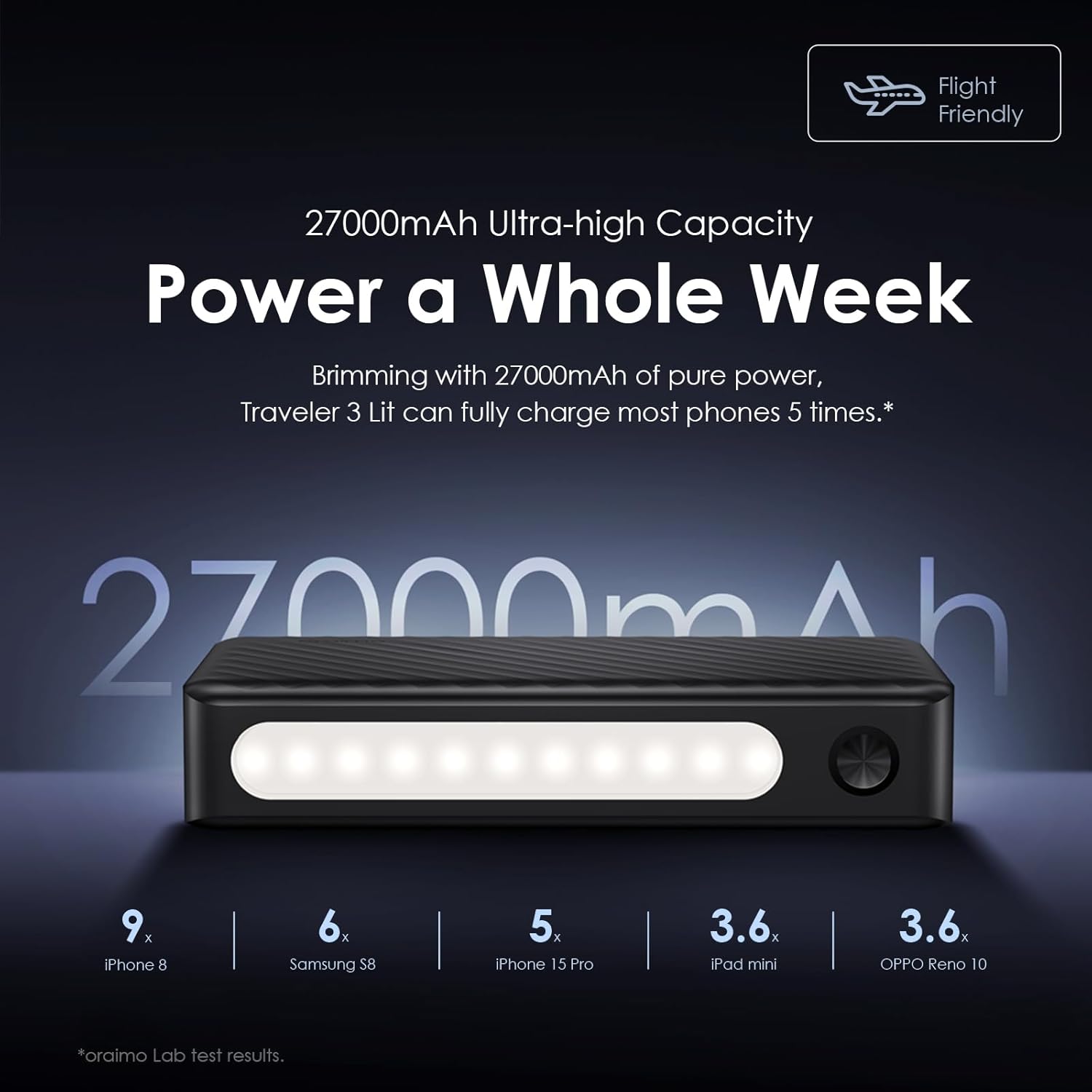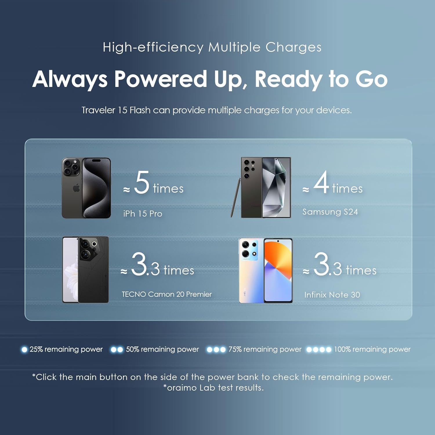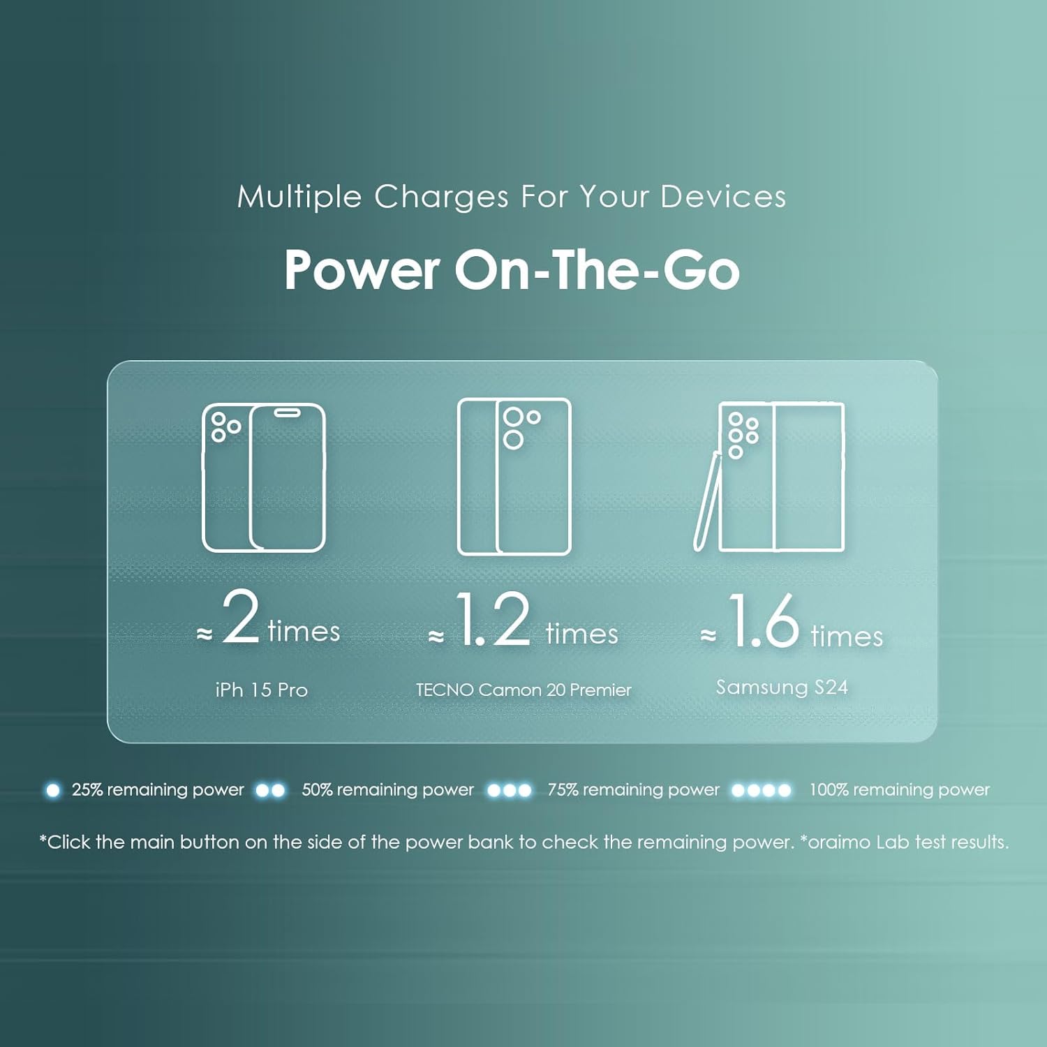 - ⚡【High-efficiency Multiple Charges,Always Powered Up, Ready to Go 】Powered by oraimo AniFast technology, It can charge for iPh 15 Pro – 5 times, charge for Samsung S24 – 4 times, charge for TECNO Camon 20 Premier – 3.3 times,charge for Infinix Note 30 – 3.3 times.